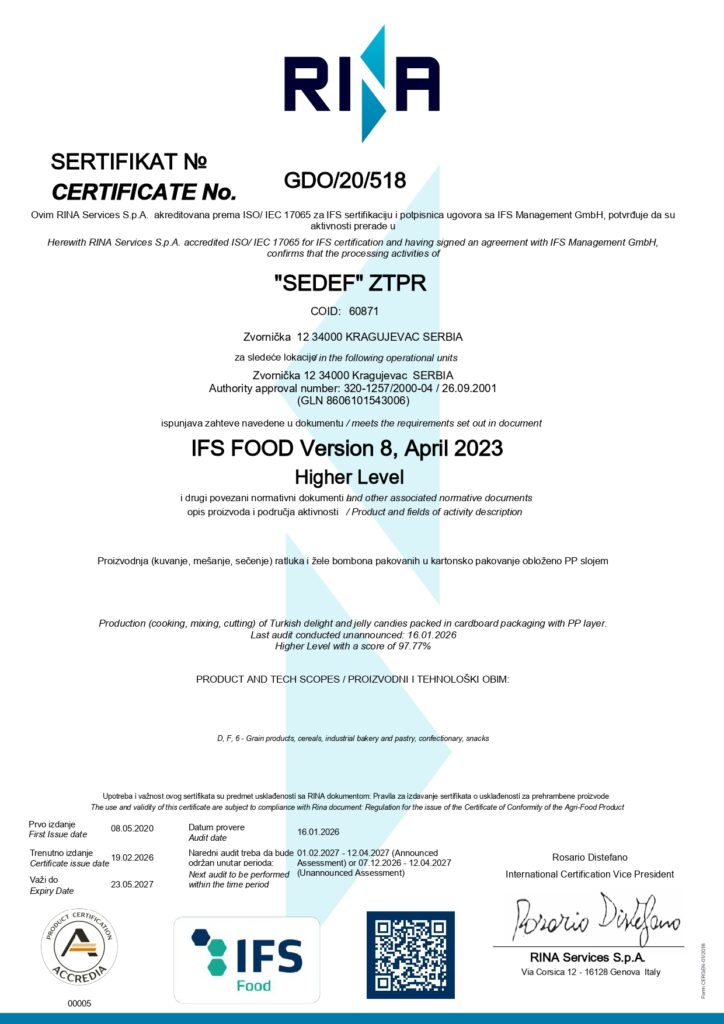 Ovaj sertifikat predstavlja krunu naših napora. Ne samo da ispunjavamo zahteve najnovije i najstrože verzije IFS standarda, već smo to postigli sa ocenom "Higher Level" i izvanrednim rezultatom od 97.77%. [cite: 48]